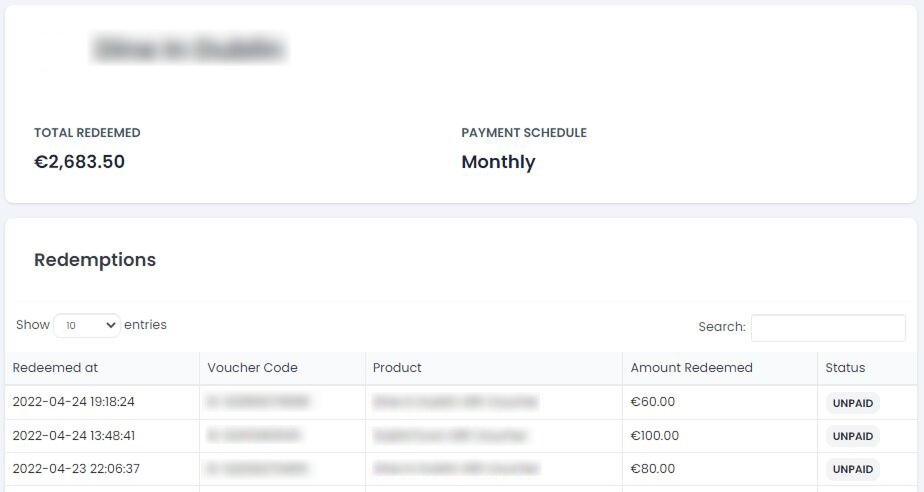 Here you will be able to view your total voucher amount redeemed, payment schedule and redemption details for each voucher redeemed, making it super easy to track what payments are due.