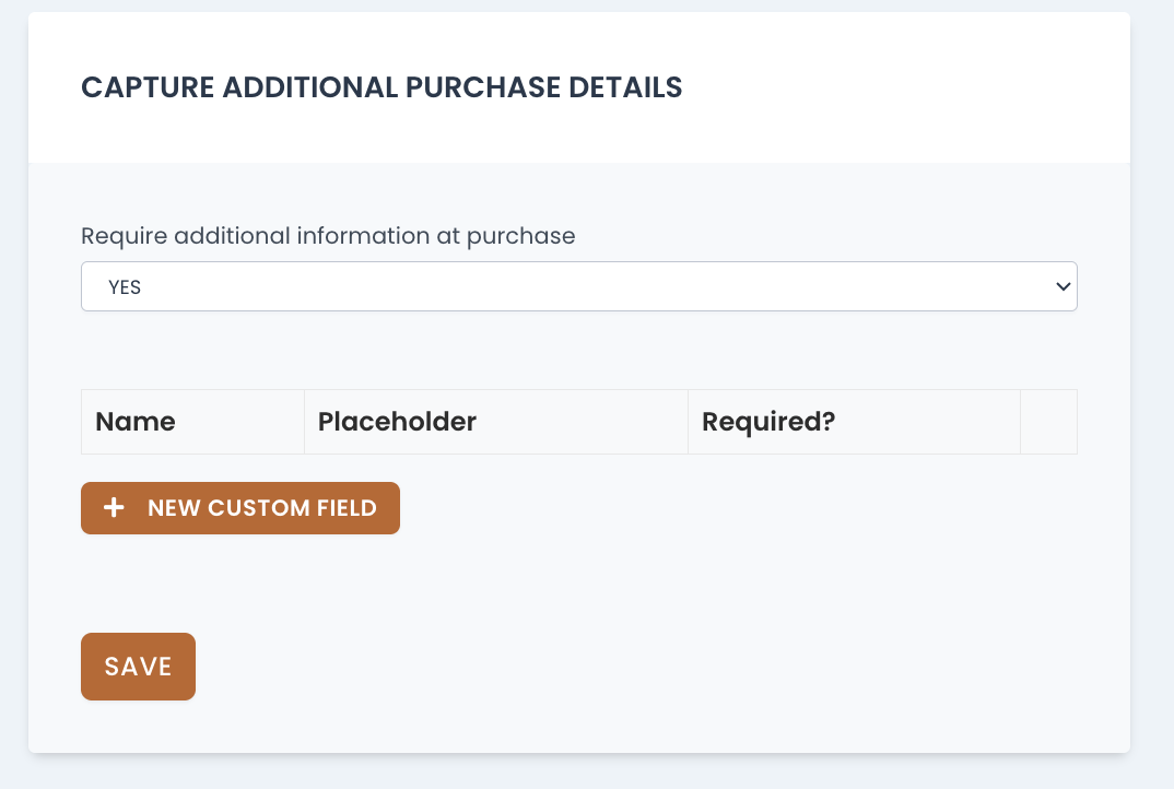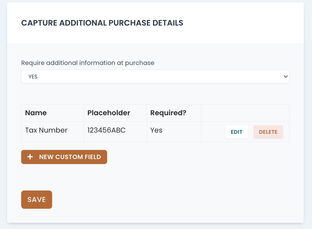 Click ‘+ New Custom Field’ which will bring up the following box where you can enter your additional details. If you select ‘Is Required’ this will ensure the customer must enter these details at checkout, it will not be an optional field.
